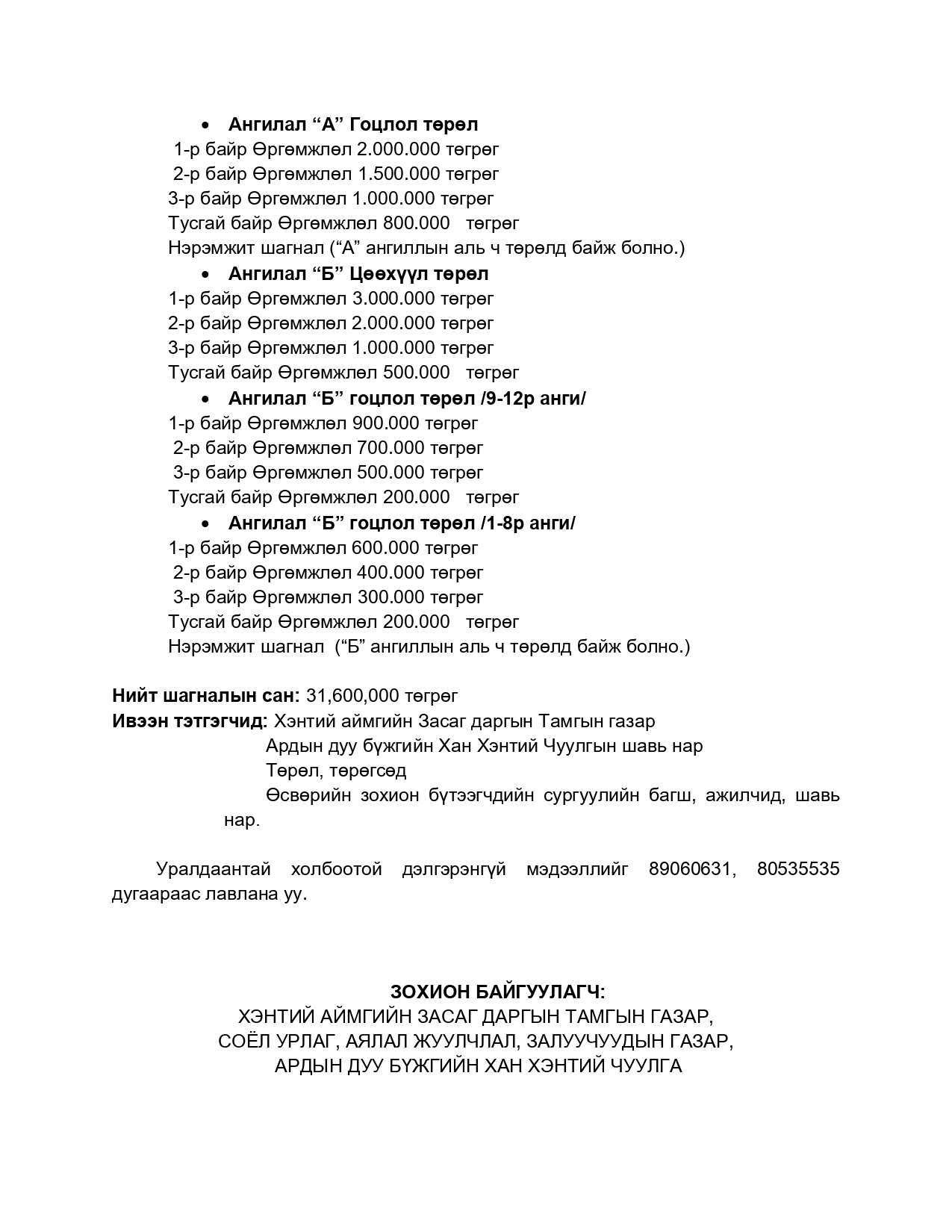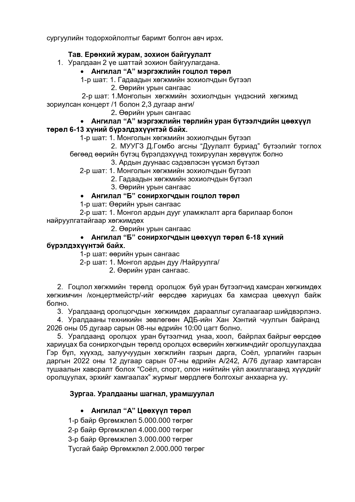 Хэнтий аймгийн Засаг даргын үйл ажиллагааны хөтөлбөрийн 3.2.9.2 дахь заалт “Аймаг орон нутгаас төрөн гарсан урлаг, соёлын алдартнуудын уран бүтээлийг сурталчлах, түгээн дэлгэрүүлэх”-ийн хэрэгжилтийг хангах, бусад мэргэжлийн театр, чуулгын уран бүтээлчдийн болон өсвөрийн хөгжимчдийн ур чадварыг дээшлүүлэх, урын санг баяжуулах, туршлага солилцох, олон нийтэд таниулан сурталчлах, түгээн дэлгэрүүлэх ажлын хүрээнд Хан Хэнтий чуулгын хөгжмийн багш асан МУУГЗ Д.Гомбын нэрэмжит гоцлол болон цөөхүүл хөгжимчдийн улсын 2 дугаар уралдааныг 2026 оны 5 дугаар сарын 8, 9 ний өдрүүдэд зохион байгуулах гэж байна. Манай уралдаан А буюу мэргэжлийн, Б буюу сонирхдын гэсэн хоёр төрлөөр насанд хүрэгчид болон өсвөрийн хөгжимчдийн дунд зохион байгуулагдна.