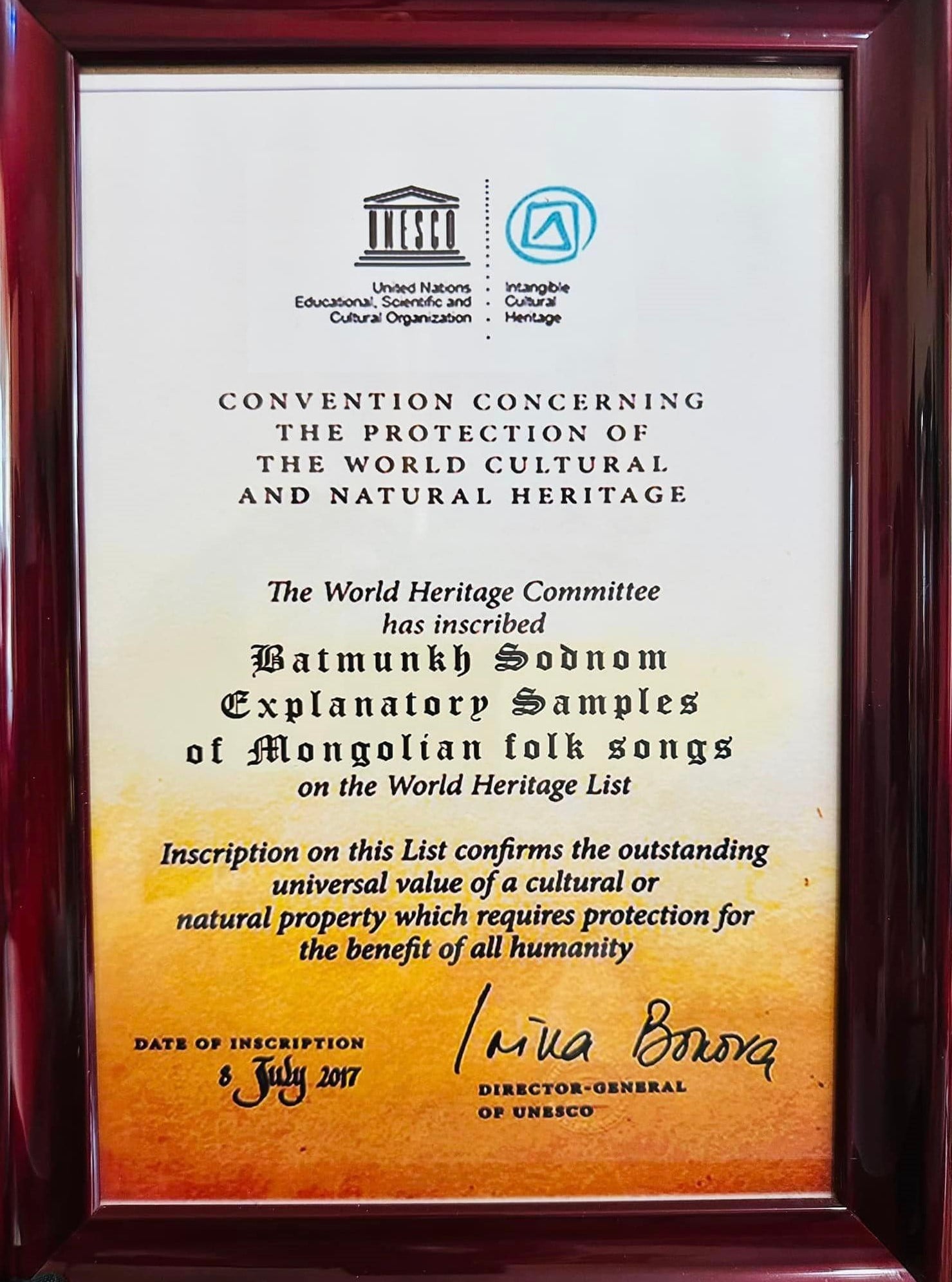 Энэхүү бүтээлийг Дундговь аймгийн харьяат Монгол ардын дуу судалгааны ЮНЕСКО-н итгэмжит элч СГЗ СОДНОМЫН БАТМӨНХ 2016 онд ЮНЕСКО-д толилуулж, "Монгол ардын дуу дуулаачдын олон янзын дэг сургууль” видео тайландаа оруулж ДЭЛХИЙН СОЁЛЫН ЯАМ буюу ЮНЕСКОД БҮРТГҮҮЛЖЭЭ.