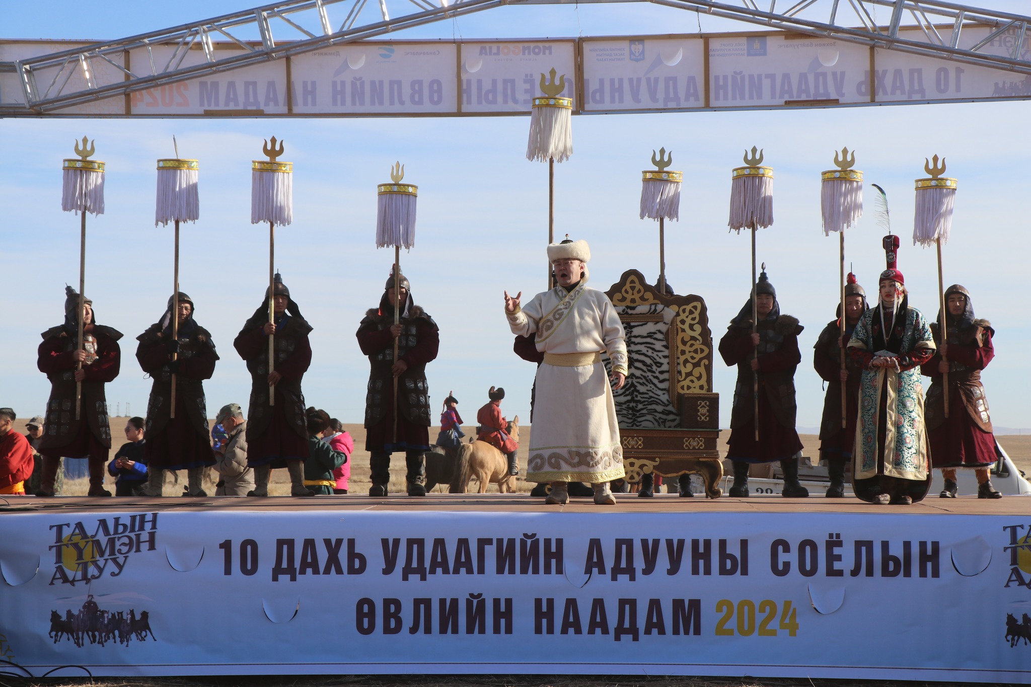 "Талын түмэн адуу 2024" өвлийн эвэнт өнөөдөр Чингис хотод нээлтээ хийлээ. 10 дахь удаагаа зохион байгуулж буй уг наадмын хамтран зохион байгуулагчаар Ардын дуу бүжгийн Хан Хэнтий чуулга оролцож байгаа бөгөөд фестивалын нээлтийн үйл ажиллагаанаас хийсэн фото сурвалжлага хүргэж байна. Дашрамд дурьдхад энэ жилийн наадам Хан Хэнтий чуулгын дэргэдэх "Их хаадын морьт хүрээ" аялал жуулчлалын цогцолборыг түшиглэн зохион байгуулагдаж байгаа билээ.