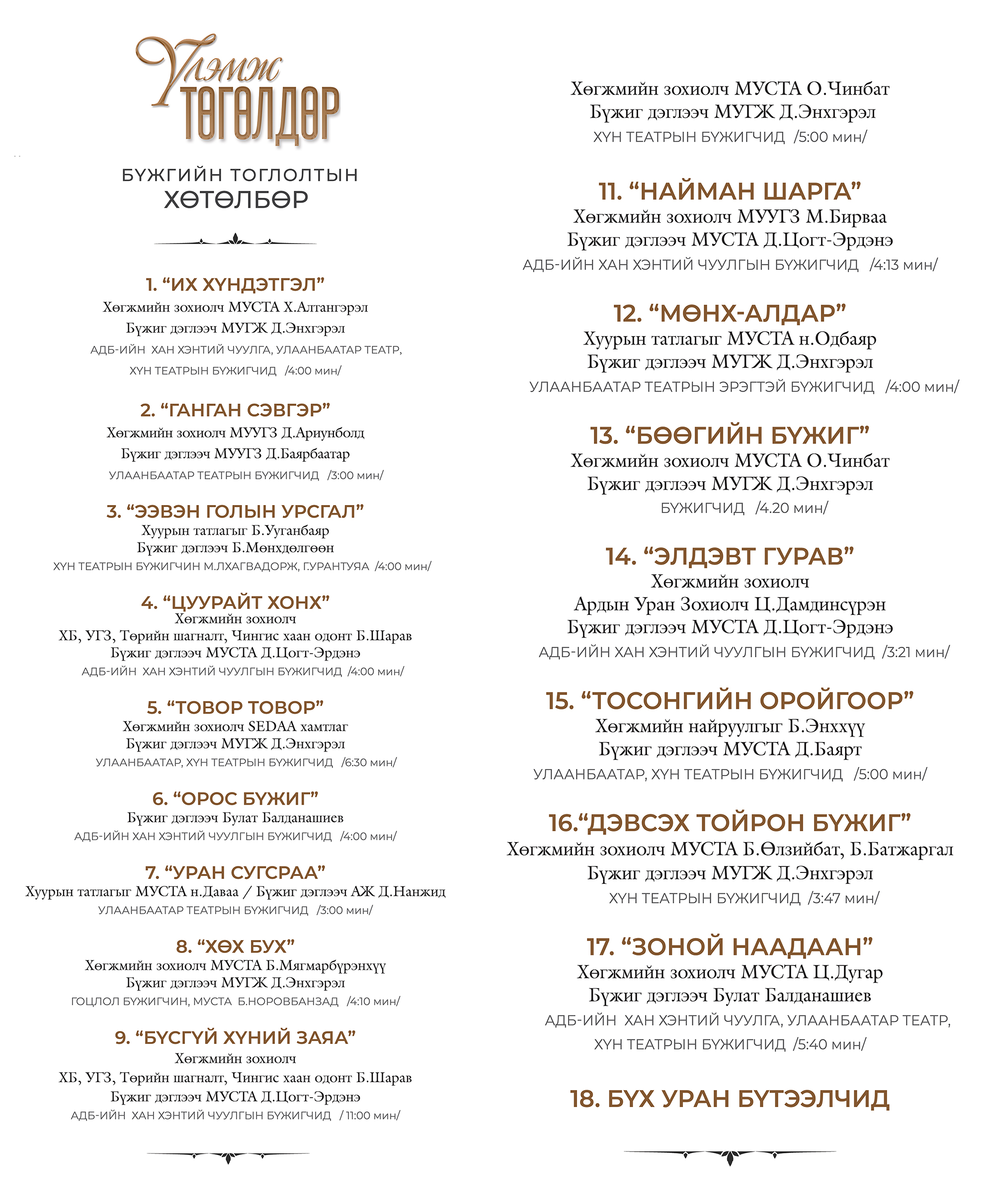 АДБ-ийн Хан Хэнтий чуулгын бүжиг ангийн уран бүтээлчид маань нийслэлийн Улаанбаатар чуулга, ХҮН театрын бүжигчидтэй хамтран 03-р сарын 15-ны өдөр 14 цагаас Соёлын Төв Өргөөний тайзнаа "Үлэмж төгөлдөр" бүжгийн тоглолтоо тоглож байна. Тоглолтын хөтөлбөрөөс та бүхэндээ хүргэж байна.