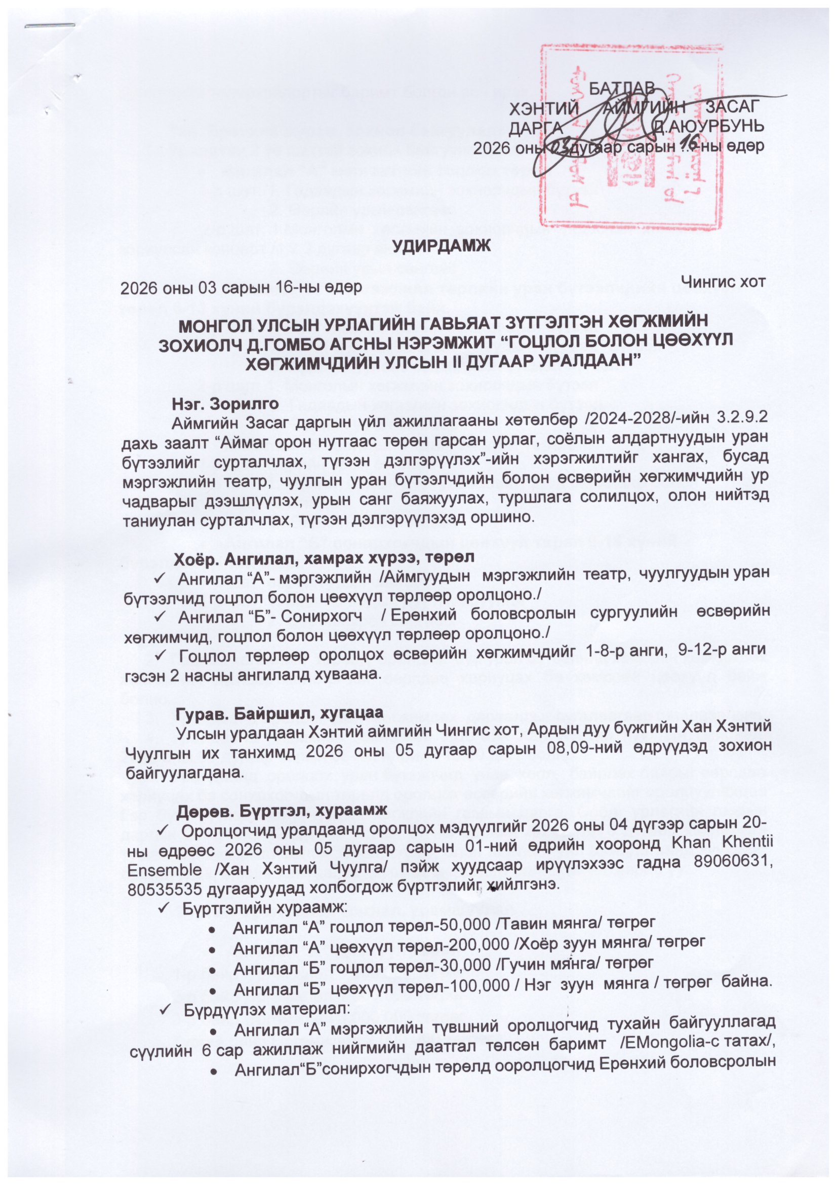 Хэнтий аймгийн Засаг даргын үйл ажиллагааны хөтөлбөрийн 3.2.9.2 дахь заалт “Аймаг орон нутгаас төрөн гарсан урлаг, соёлын алдартнуудын уран бүтээлийг сурталчлах, түгээн дэлгэрүүлэх”-ийн хэрэгжилтийг хангах, бусад мэргэжлийн театр, чуулгын уран бүтээлчдийн болон өсвөрийн хөгжимчдийн ур чадварыг дээшлүүлэх, урын санг баяжуулах, туршлага солилцох, олон нийтэд таниулан сурталчлах, түгээн дэлгэрүүлэх ажлын хүрээнд Хан Хэнтий чуулгын хөгжмийн багш асан МУУГЗ Д.Гомбын нэрэмжит гоцлол болон цөөхүүл хөгжимчдийн улсын 2 дугаар уралдааныг 2026 оны 5 дугаар сарын 8, 9 ний өдрүүдэд зохион байгуулах гэж байна. Манай уралдаан А буюу мэргэжлийн, Б буюу сонирхдын гэсэн хоёр төрлөөр насанд хүрэгчид болон өсвөрийн хөгжимчдийн дунд зохион байгуулагдна.
